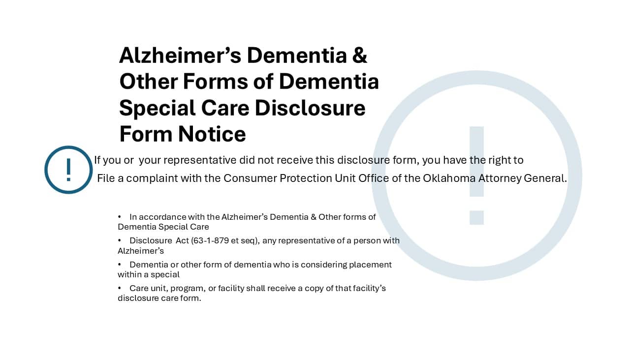 As of November 1st, 2025, any facility in Oklahoma offering services for Alzheimer’s and/or dementia in a special care unit shall provide the Alzheimer Dementia Disclosure Act to any person or representative of said person who is considering placement.